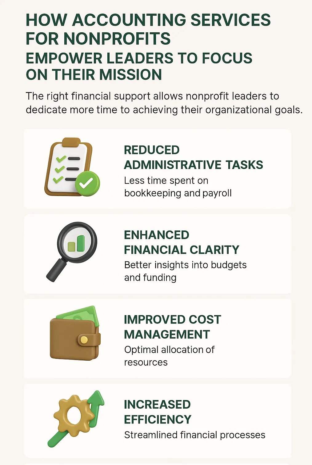 “In our work with nonprofits, we’ve learned that the biggest barrier to impact isn’t lack of passion—it’s leaders being buried in financial tasks. When accounting systems are clear, compliant, and transparent, directors regain the freedom to lead, inspire, and grow their mission.”