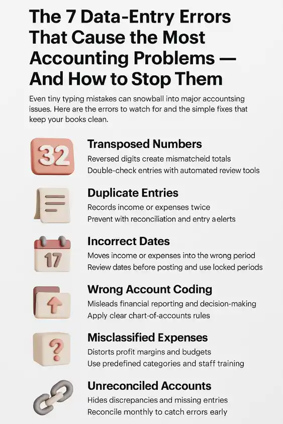 Data-entry errors are among the most frequent causes of accounting problems, and they often stay hidden until financial reports stop aligning, cash flow trends look unusual, or monthly reconciliations repeatedly fail. For searchers wanting to understand the data-entry errors that cause the most accounting issues—and how to stop them, this guide offers clear, experience-backed insights grounded in real client work.